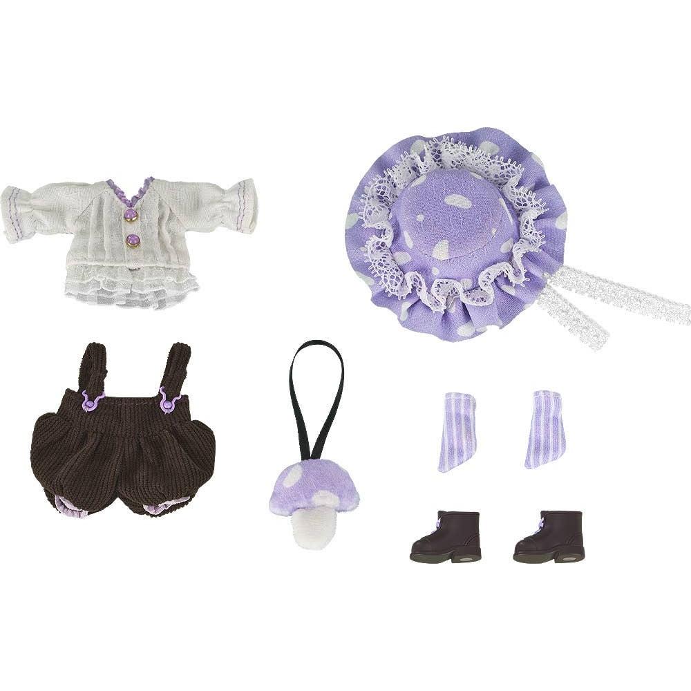 The Nendoroid Doll Outfit Set: Mushroom - Boy (Purple) is a dedicated outfit set for Nendoroid Dolls, featuring an adorable boy style outfit with a mushroom theme. It is characterized by its purple mushroom design and can be used with Nendoroid Dolls for various character expressions. The set includes a hat, top, overalls, shoulder bag, socks, and shoes with magnets, making it easy to wear and change.