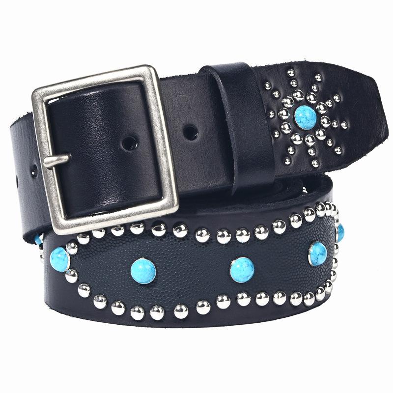 Men's Fashion 4.5cm Wide Genuine Leather Belt First Layer Cowhide Imitation Turquoise Inlay Rivet Punk Belt for Jeans
