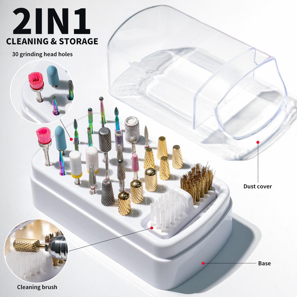 2v1 Hlavička na leštění nehtů Čisticí box na prach 30 otvorů Organizér na hlavičky laků na nehty Akrylový přenosný organizér Prachotěsný