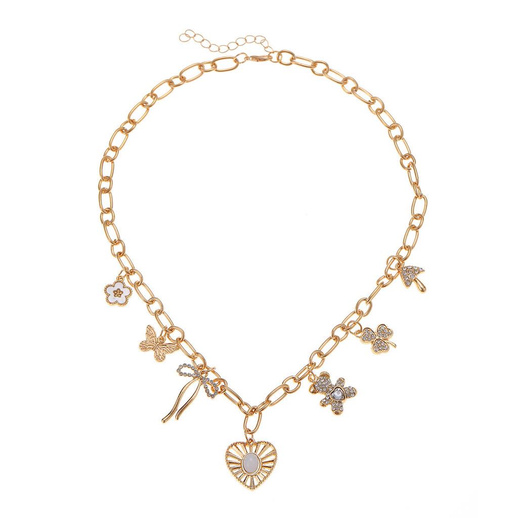 Heart Pendant Necklace For Women With Butterfly Bow And Clover Charm In Silver Plating