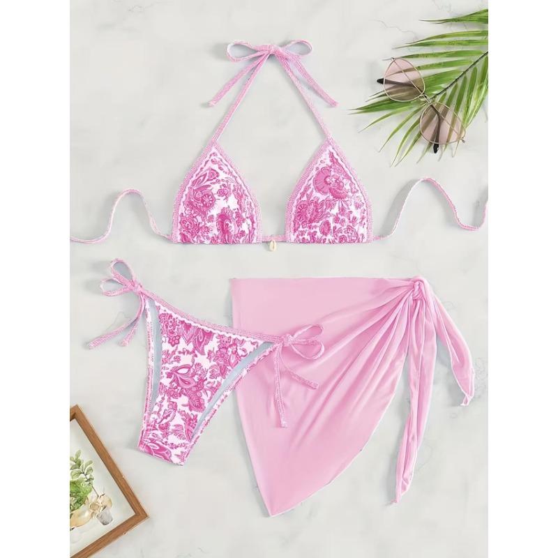 Women's Pink Paisley 3 Piece Bikini Set Halter Triangle Swimsuit With Cover Up Skirt