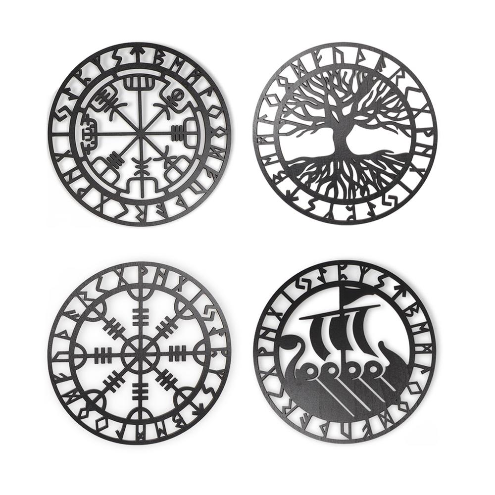 4PCS Set Round Wall Art Nordics Viking Runes Wooden Wall Decor Celtic Family Trees Viking Decor Amulet Sign Home Office Decor