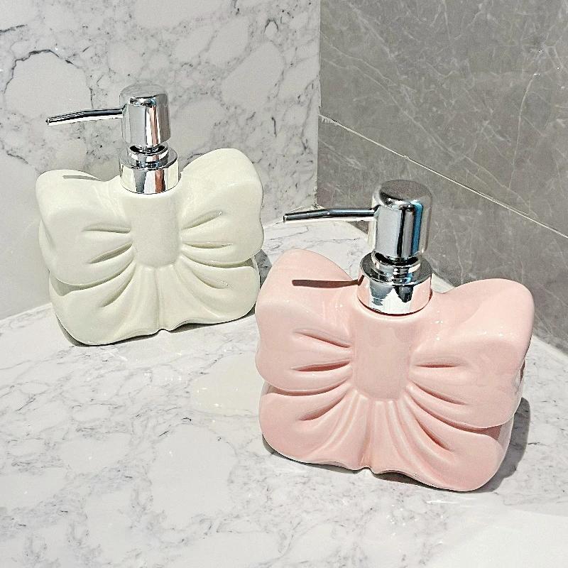 1pc, Ceramics Bowknot Lotion Press Bottle, Household Bathroom Shower Gel Bottle, Plastic Pump Head, Bathroom Liquid Dispenser