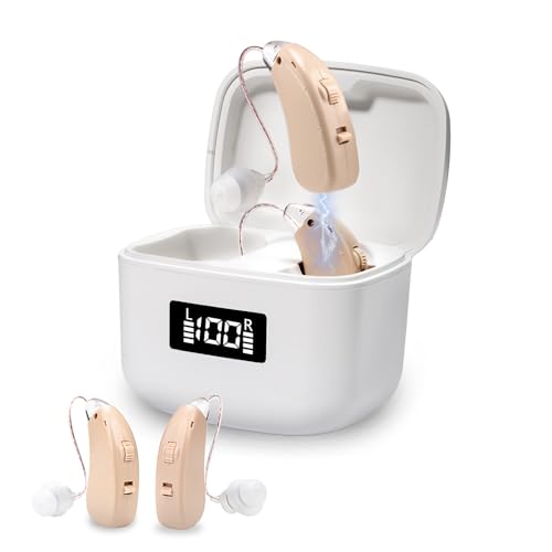 [Type-C Charging & Battery Level Display] The rechargeable hearing aid provides up to 24-30 hours of continuous use on a single charge! From greeting family in the morning to watching TV in the evening, it provides complete hearing support for a day. The compact charging case is convenient to carry in your pocket and provides an additional 100 hours of charge. The LED indicator allows you to check the remaining battery life (the number shows the remaining battery life of the charging case) at a glance. A full charge will charge the hearing aid approximately 7-8 times! When both hearing aids are charging, the indicator lights will light up simultaneously. A digital display will appear when the charging case is charging. Charging is complete when it reaches "100".