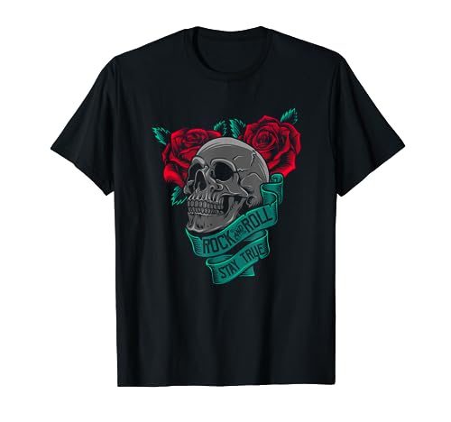 Rock and Roll Stay True - Rock and Roll Goth Skull with Roses T-Shirt