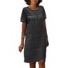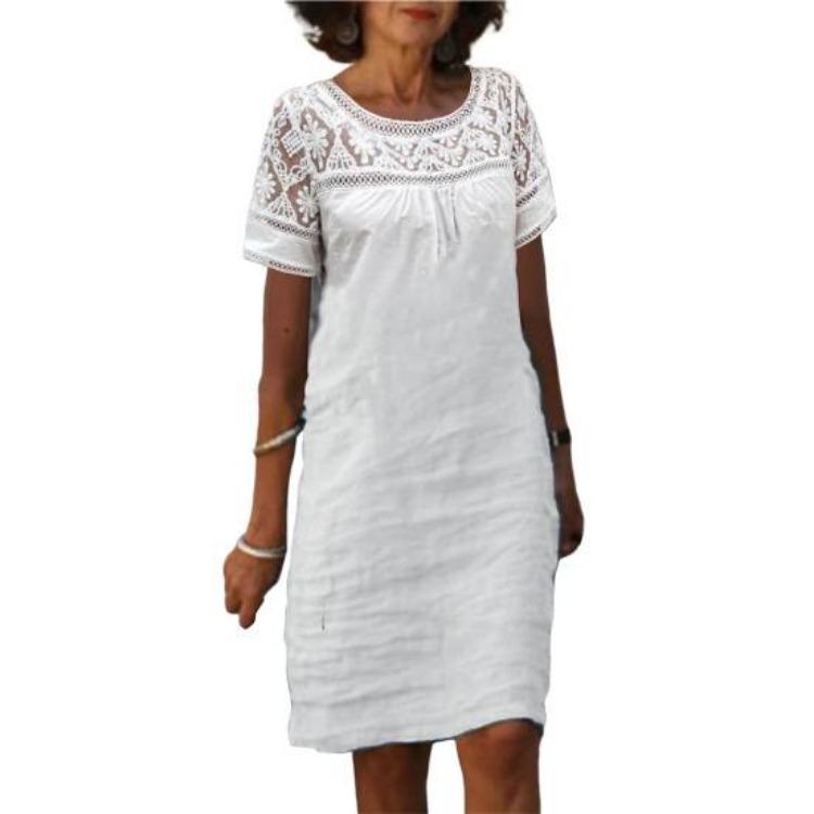 Women Casual Summer Loose Cotton Linen Mini Short Sleeve Round Neck Lace Sundress Beach Short Dresses