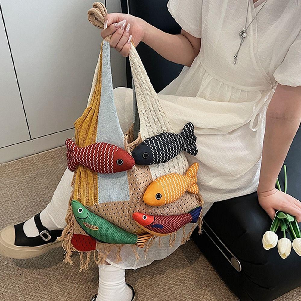 Summer Cotten Crochet Shoulder Bag Fish Tassels Beach Handbag Hollow Out Weave Bag Shopping Bag