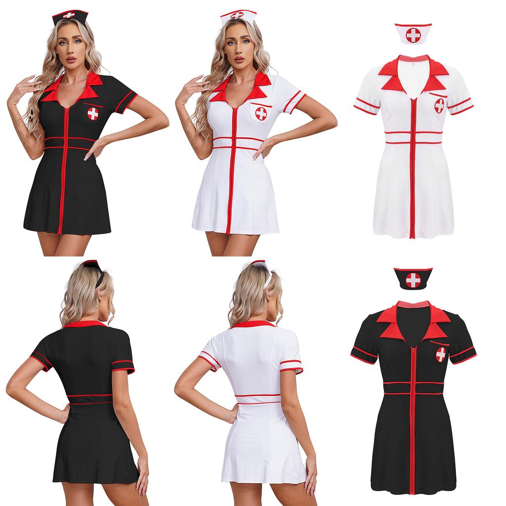 2-piece set includes a dress and a nurse hat. Designed with lapel v neck, front zipper, cross patches, contrast strips and A-line dress.