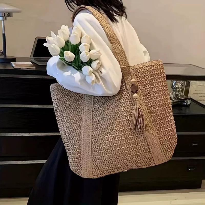 1pcs Paper Commuting Handbag Woven Handheld Beach Bag Women's Shoulder Bag Suitable for Daily Work and Shopping