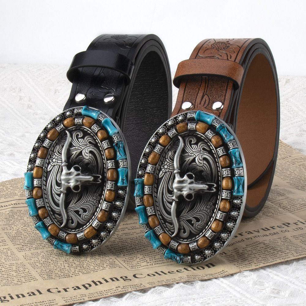 Carved Western Cowboy Belt Cow Head Buckle Embossed Belt Luxury Waistband For Man Women