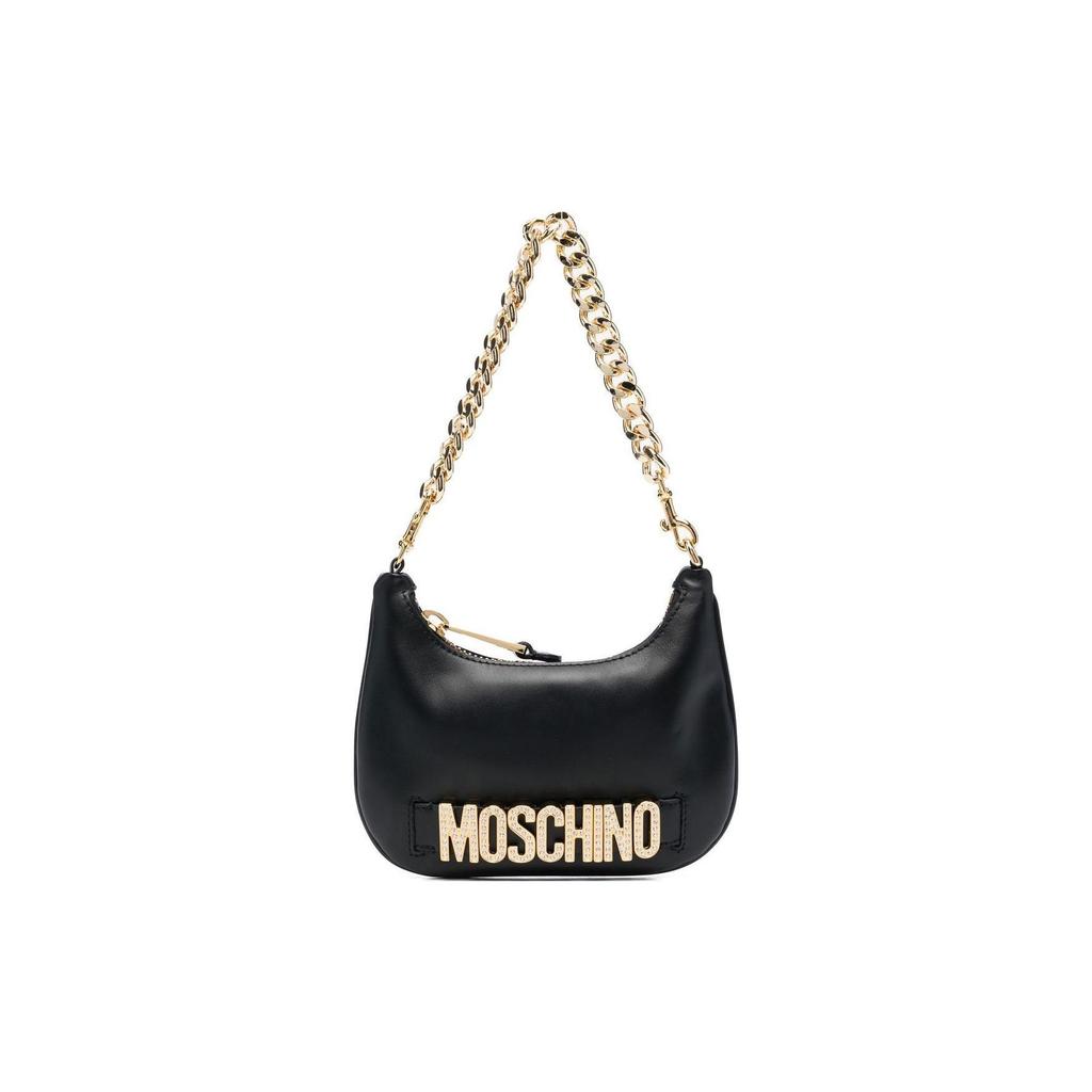 Moschino Logo Decorated Detachable Chain Handle Zip Closure Calfskin Tote Shoulder Bag Women bags Black A757980243555