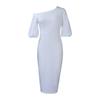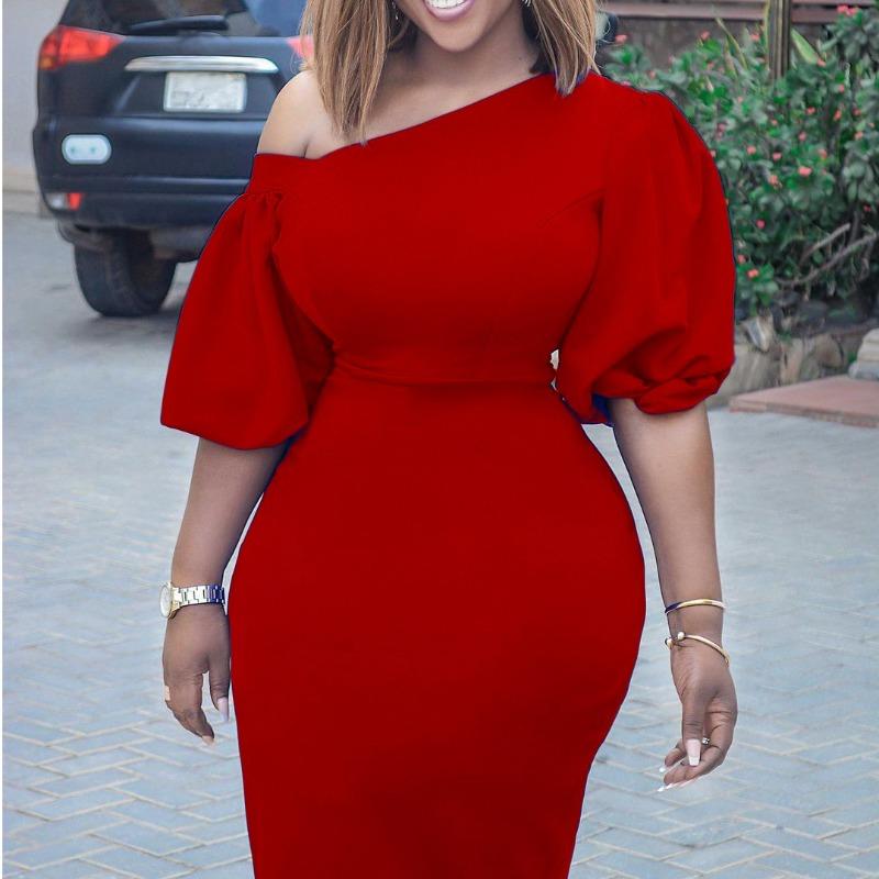 Women's clothing summer new solid color slanted shoulder bubble sleeve temperament Tongle large size dress