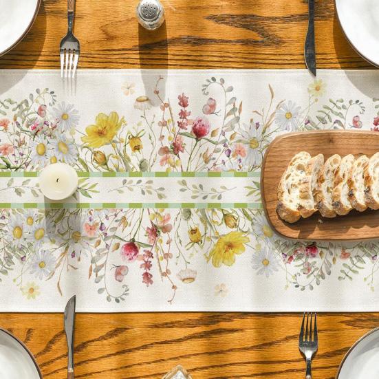 Floral Table Runner Spring Summer Linen Watercolor Flowers Plants Table Runner Machine Washable Table Protector for Home Farmhouse Dinner Party