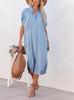 Women's Casual Loose Solid Color Short Sleeved Long Slit Shirt Dress with Shoulder Sleeves and Button Up Dress
