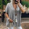 Women's Casual Loose Color Dropped Shoulder Short Sleeve V Neck Sequin Top T-Shirt