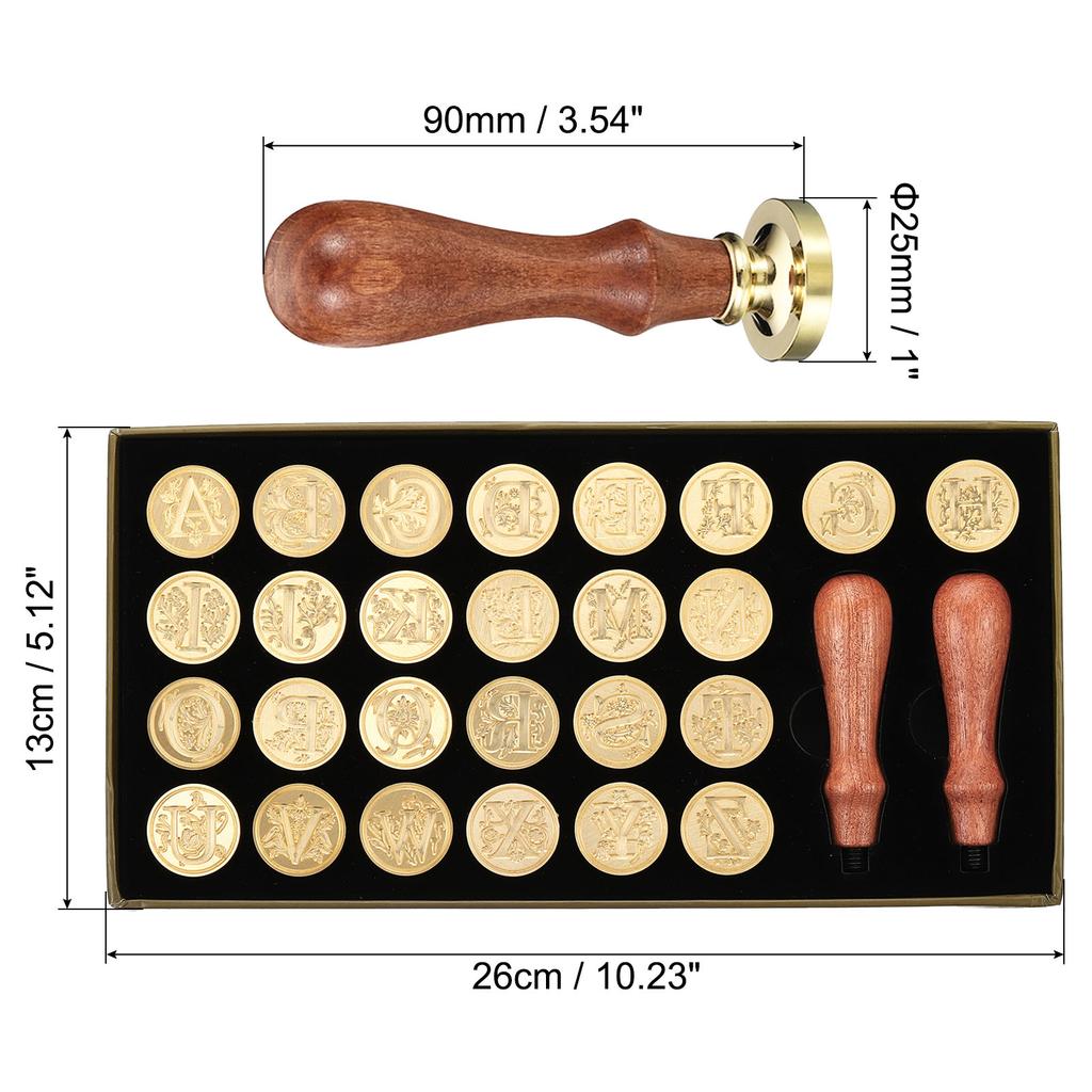 Sada pečetních razítek s voskem, 26 písmen A-Z Pečetní razítko s voskem se 2 ks dřevěnými rukojeťmi, Dárková krabička, Písmeno, Iniciála, Mosazná hlava, Vintage
