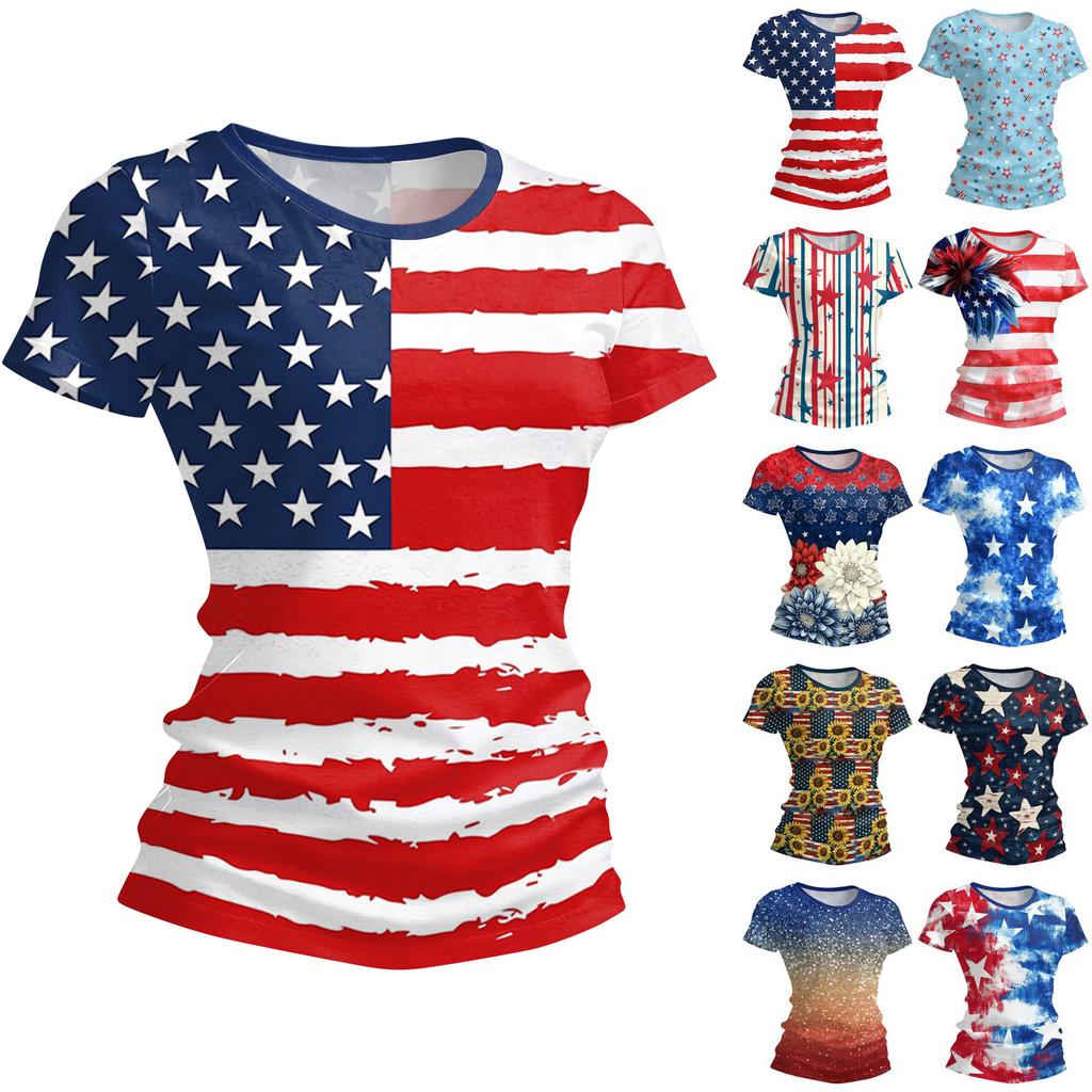 Women's Fashion Round Neck Independence Day Print Short Sleeve Loose Crewneck T-Shirt Top