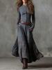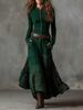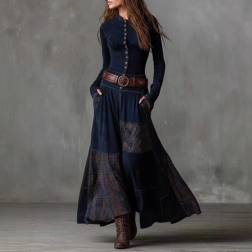 Paired with a matching long skirt that includes functional side pockets and a stylish brown-gray plaid fabric trim at the hem, adding a playful contrast to the solid design.