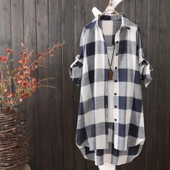 Dámské košile s dlouhým rukávem, stahovací rukávy, klopy, střední délka, károvaný potisk, jednoduchý vzhled jsou mezi ženami velmi oblíbené.