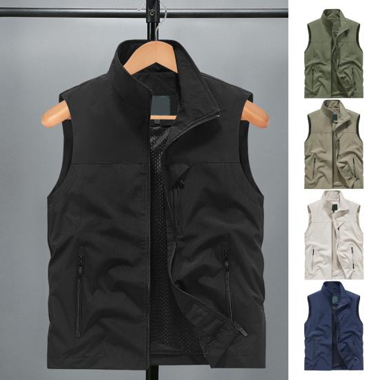 Pánská vesta stojáček límec bez rukávů vesta se zapínáním na zip kabát s velkými kapsami jednobarevná outdoorová rybářská vesta
