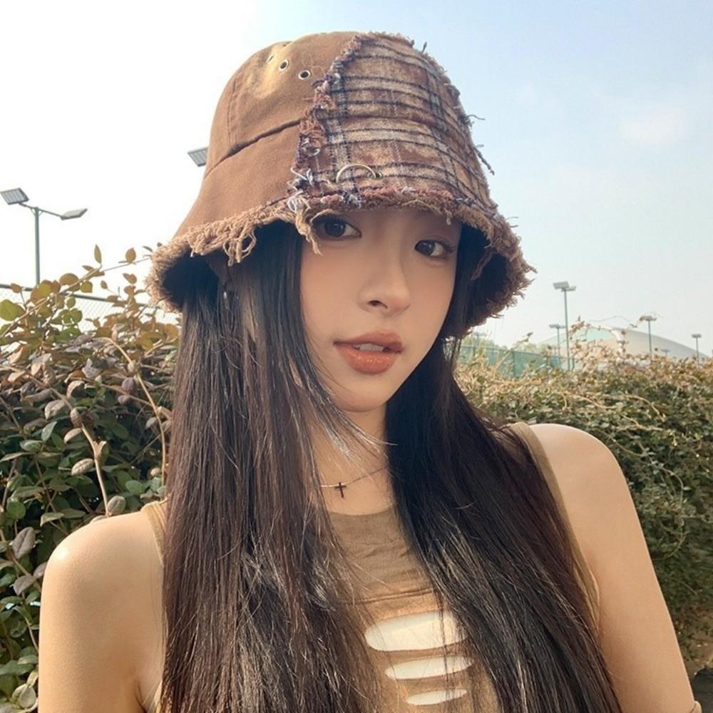 Beggar Style Plaid Bucket Hat Patched Sun Protection Basin Cap Fashion Retro Fisherman Hat Women