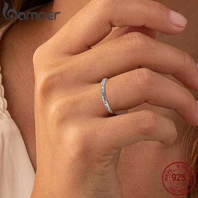 BAMOER Stříbrný 925 Vintage Reliéfní Kroužek s Vzorcem Vinné Lozy pro Ženy, Stohovatelný Gravírovaný Kroužek s Iridií Minimalistický Denní Dárek