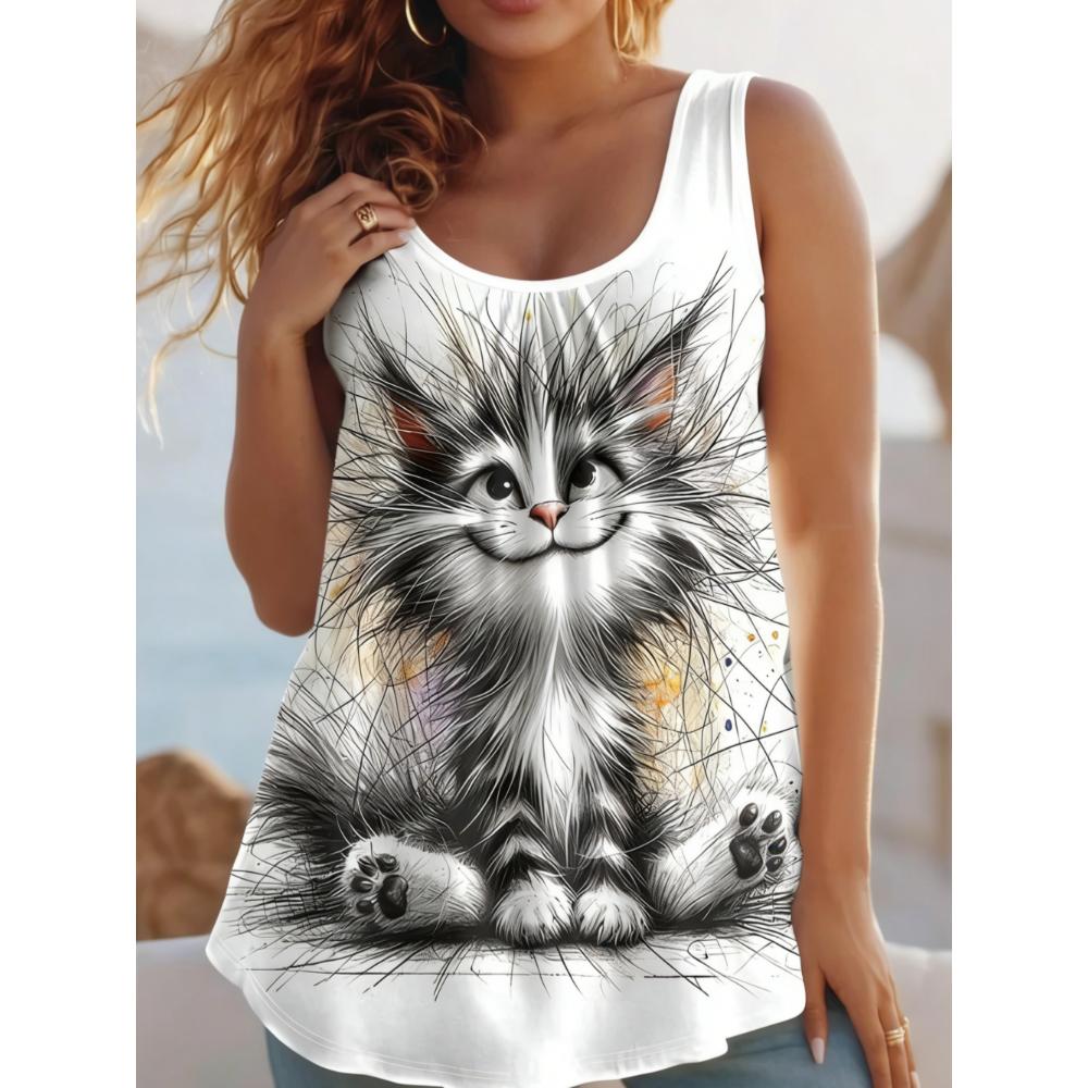 Summer Women's Large Size 3D Printing Flower Tiger Cat Vest Loose Fashionable Comfortable Soft Breathable O Neck Sleeveless Vest