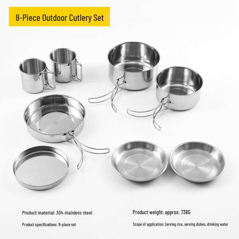 8-Piece Portable Stainless Steel Camping Tableware Set: Foldable Cups, Bowls, and Plates for Outdoor Picnic and BBQ Adventures