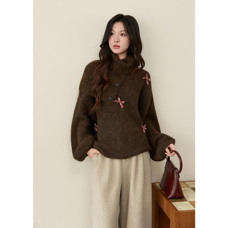 Women's French Retro Plaid Bowknot Sweater with Detachable Collar