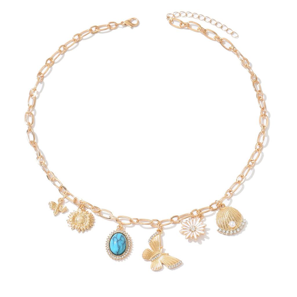 This flower-themed necklace features a delicate sunflower and bee or butterfly pendant, crafted from metal with electroplating for a vibrant finish. The alloy pendant measures approximatelystandard chain, creating a fresh, natural look. Ideal for summer outfits, it complements casual and bohemian styles. Wipe clean with a damp cloth to maintain its brightness.