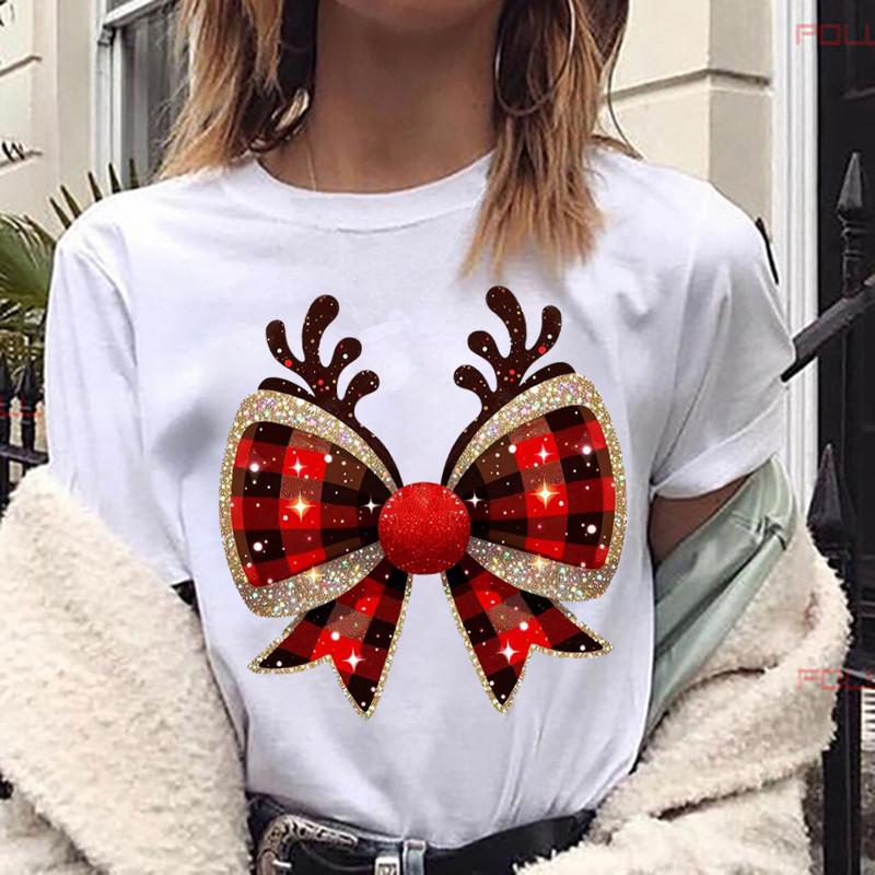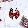 Fashion Reindeer Antlers Bow Plaid Women T Shirt Funny Graphic Christmas Party Outfit Harajuku Casual FeUnisex Clothes Tees