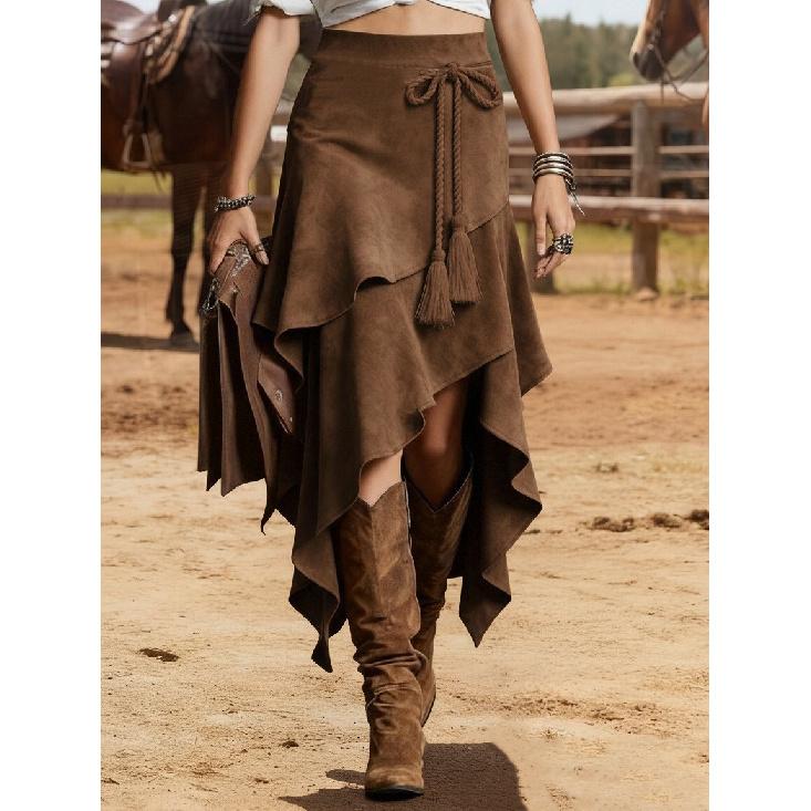 Women's faux suede vintage style irregular ruffle midi skirt with waist tie and tassel decoration
