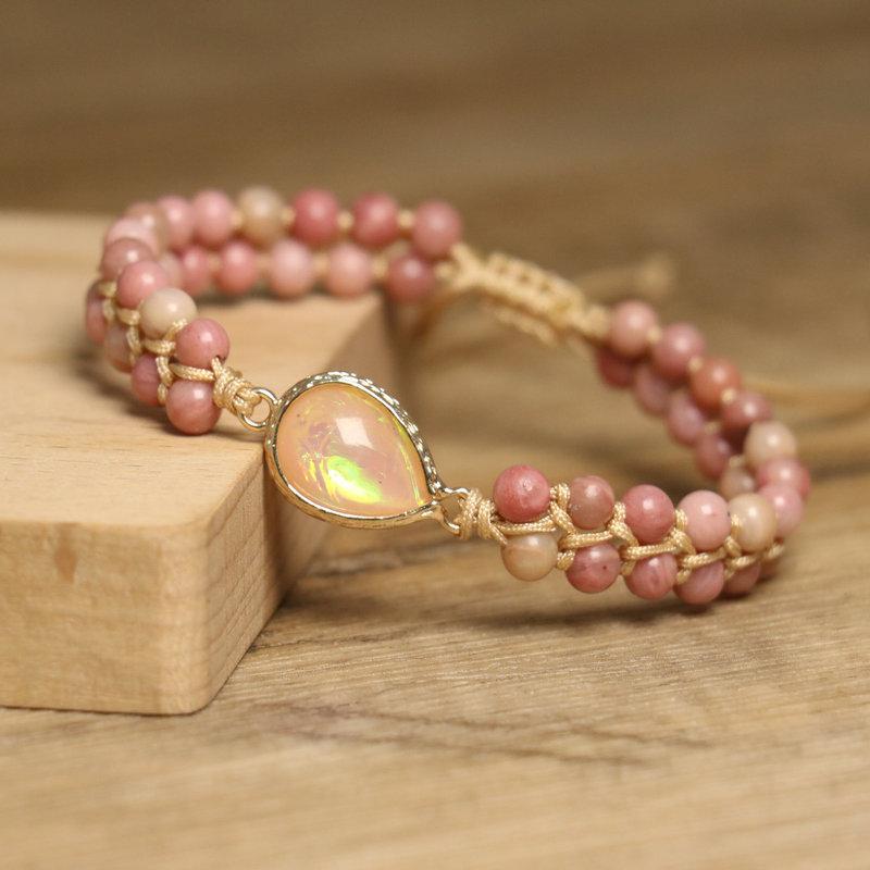 Pink Rhodochrosite Teardrop Opal Bracelet – Gold Accent Boho Healing Jewelry, Adjustable Love Gift for Women