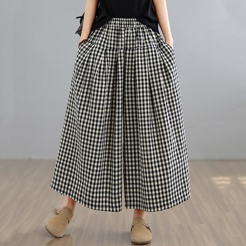 Plus size Vintage plaid high Waist Casual loose spring Summer wide leg Pants Women Trousers