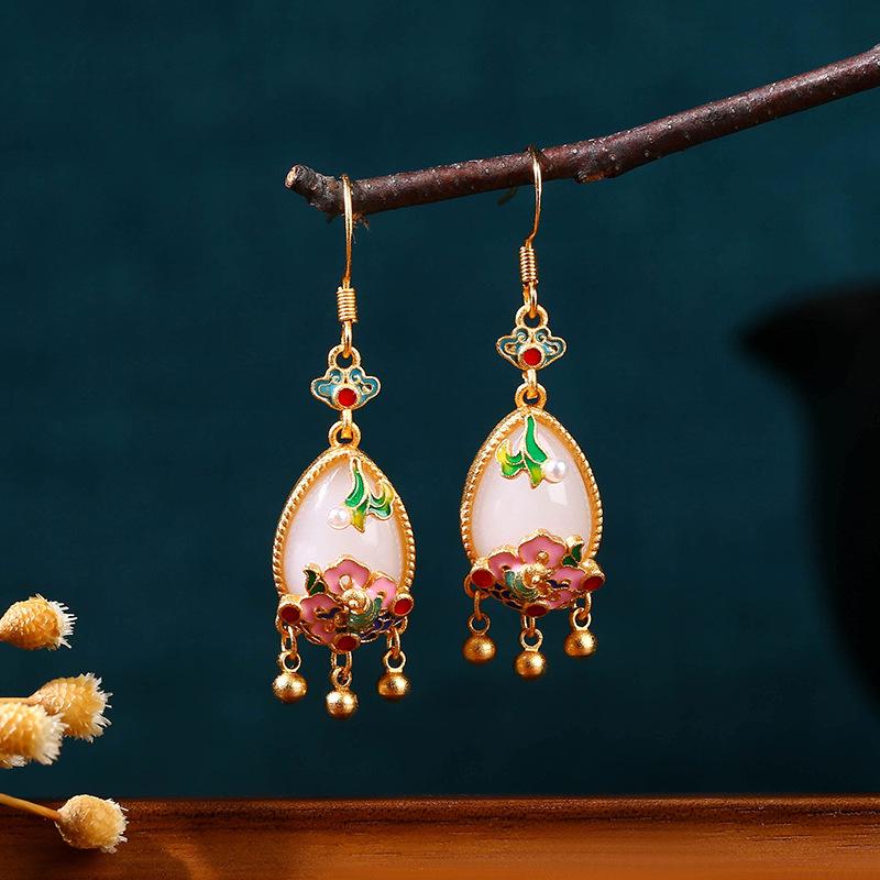 925 Sterling Silver Chinese Enamel Earrings - Gradient Blooming Flower Design with Imitation Jade for Women, Qipao Hanfu Style