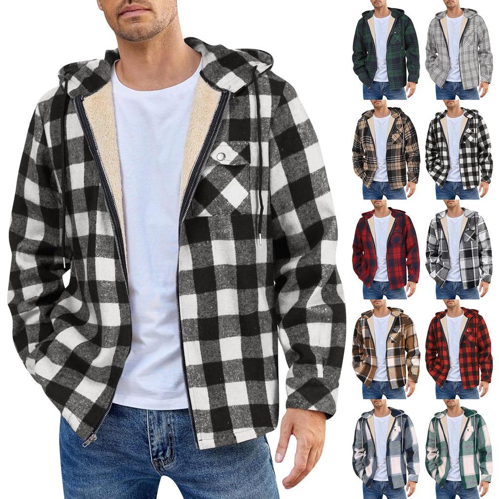Pánská prošívaná podšitá kostkovaná košile se zapínáním na knoflíky a sametovou bundou s kapucí