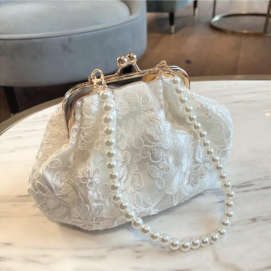 Retro Krajkový Květinový Dámský Večerní Kabelka Luxusní Design Perlový Řetízek Dámská Večerní Spojka Dámská Crossbody Taška