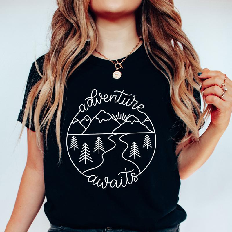 Adventure Awaits Outdoor Graphic T Shirts Women Mountain Nature Lover Gift Crew Neck Short Sleeve Tshirt Adventure Classic Tops