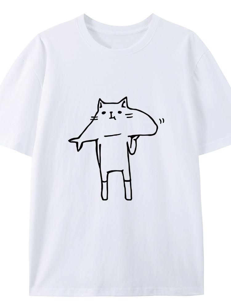 Fun Cat Eating Fish Printed Tshirt Short Sleeve Round Neck Casual Fashion Daily Versatile Womens Tshirt