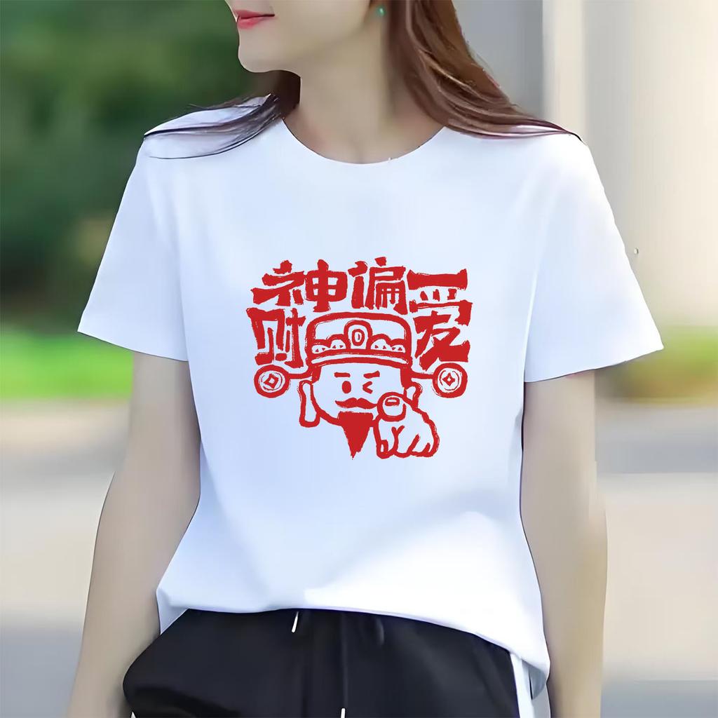 God of Wealth printed short sleeved round neck Womens Tshirt for spring and summer versatile Womens Tshirt