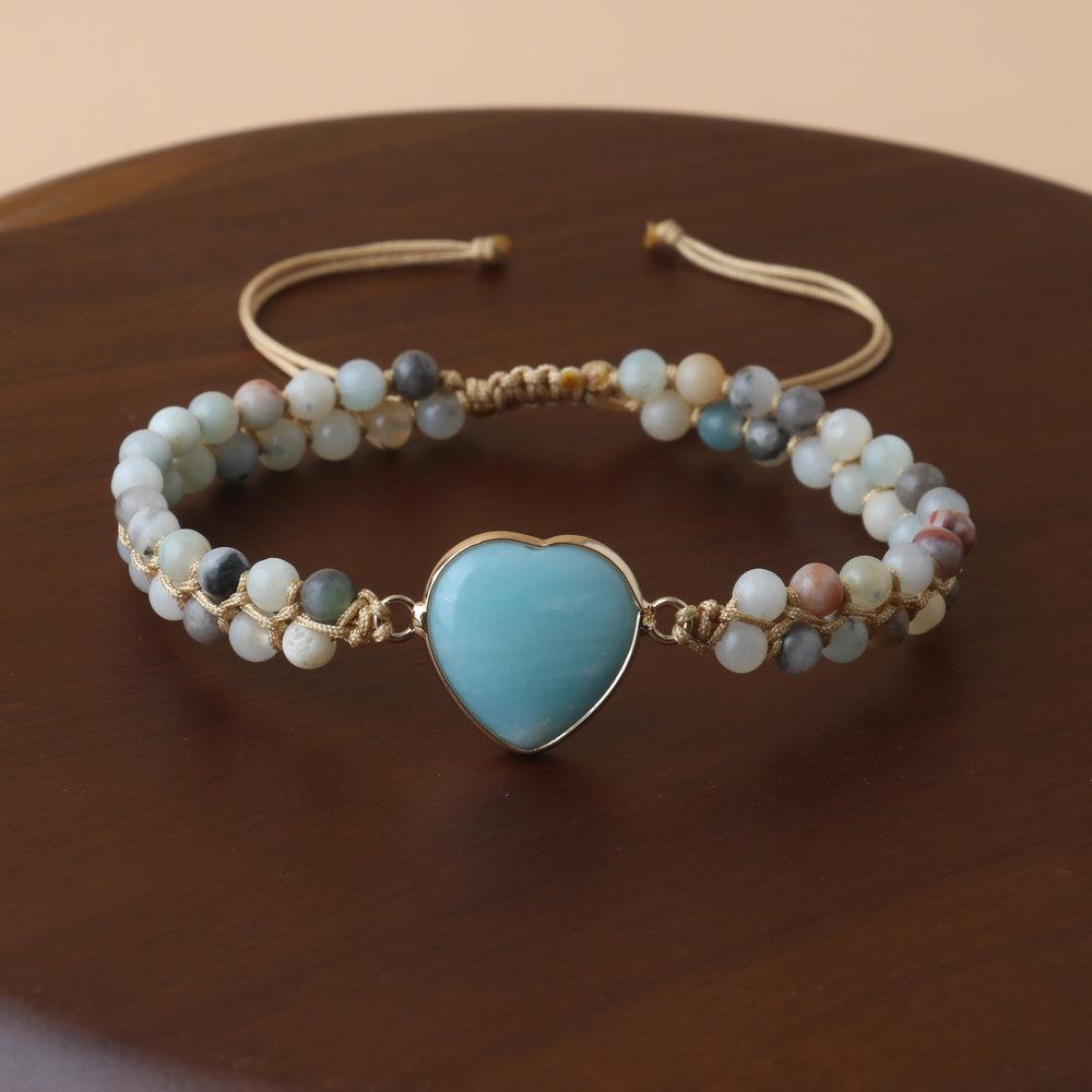 Amazonite Heart Beaded Bracelet – Mixed Stone & Gold Accent Adjustable Dainty Jewelry, Love Calm Gift for Women
