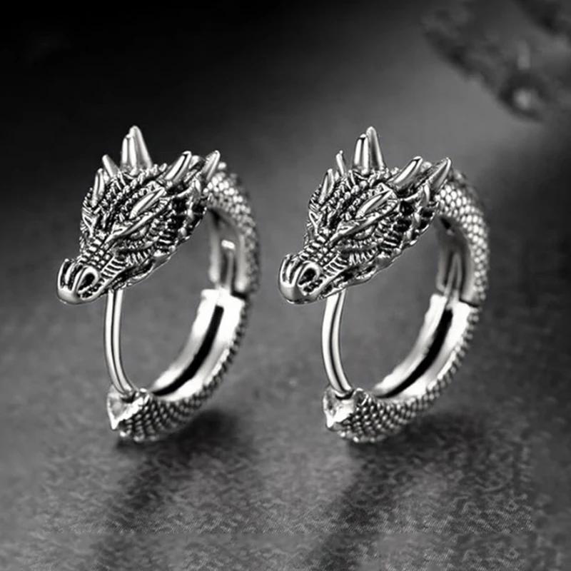 Huitan Personality Chinese Dragon Hoop Earrings for Women/Men Antique Metal Color Hip Hop Cool Guys Loong Earrings Jewelry