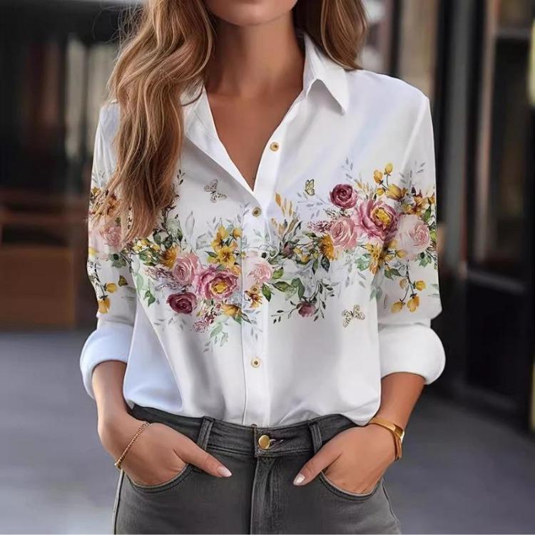Spring Fall Floral Print Button Front Shirt Casual Long Sleeve Womens Clothing