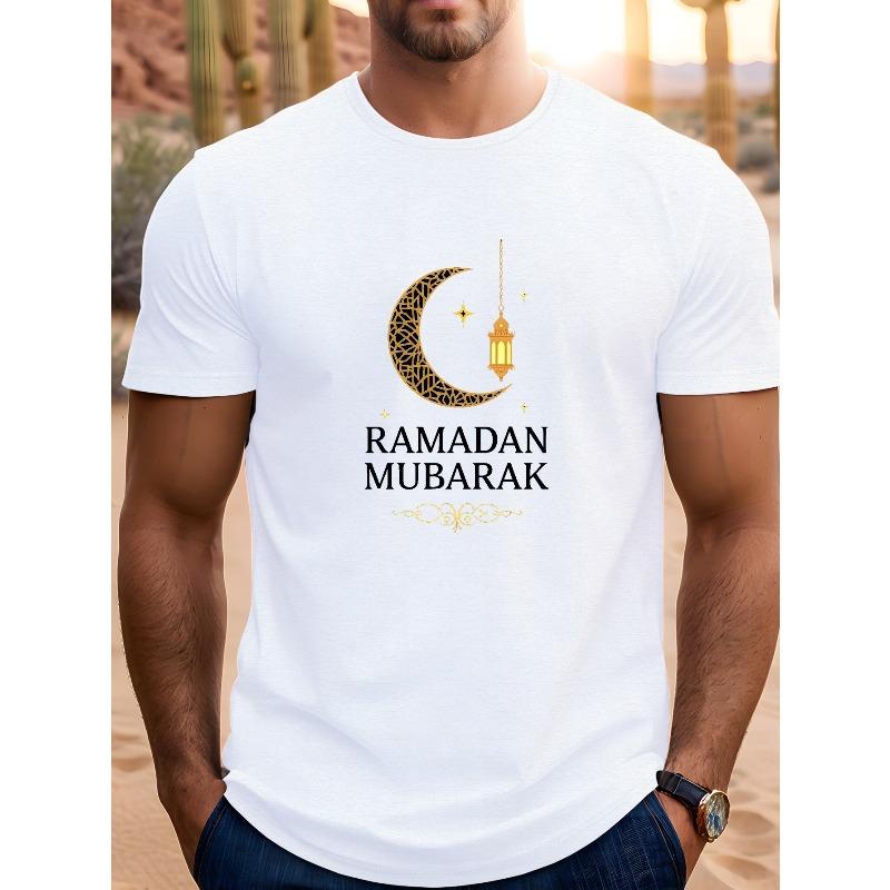 Men's Casual Short Sleeve T-Shirt- Golden Crescent Star Print, Summer T-Shirt, Crew Neck, Regular Fit, Perfect for Spr Eid Men's T-shirt