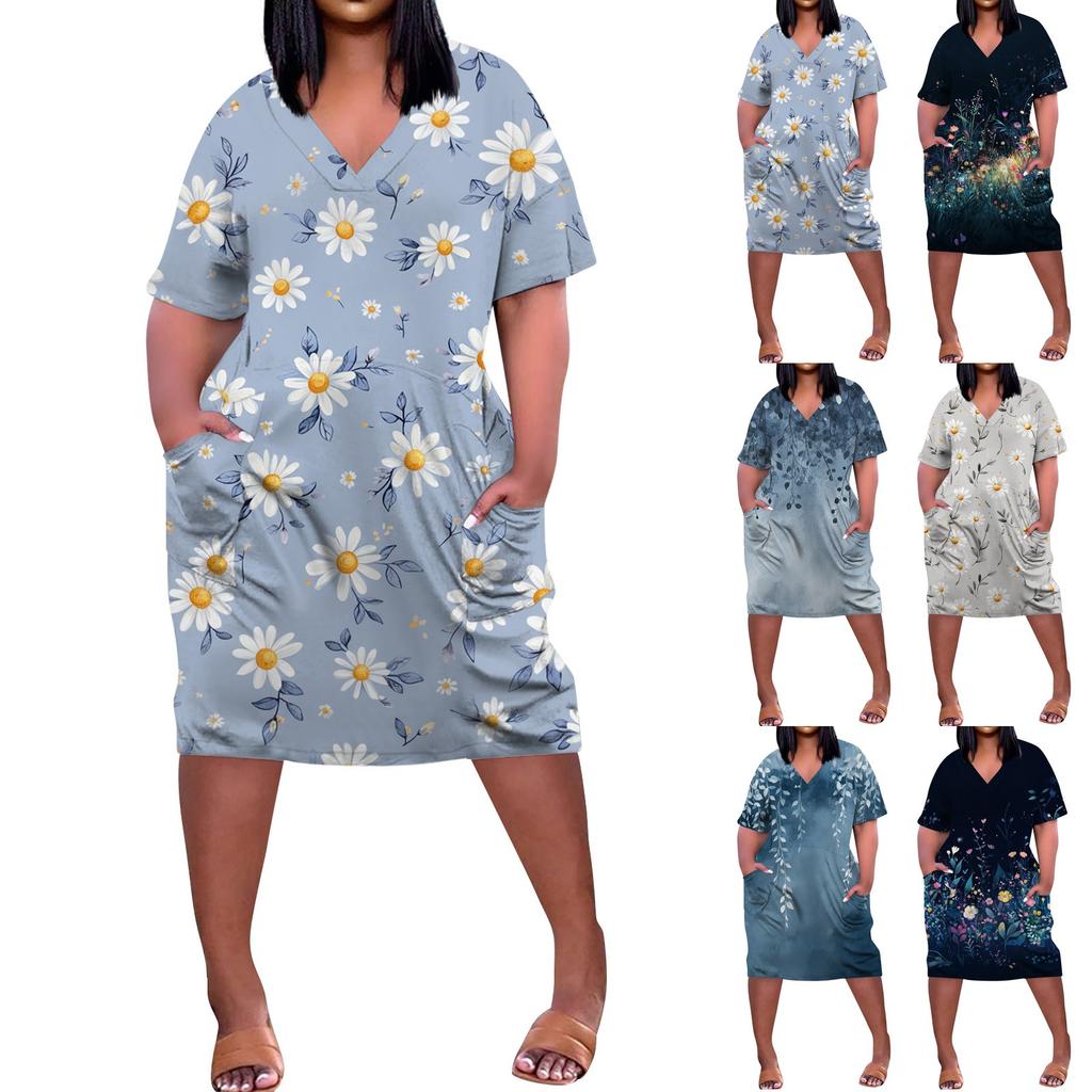 Summer Plus Size V Neck Short Sleeve Knee Pocket Print Casual Dress For Women