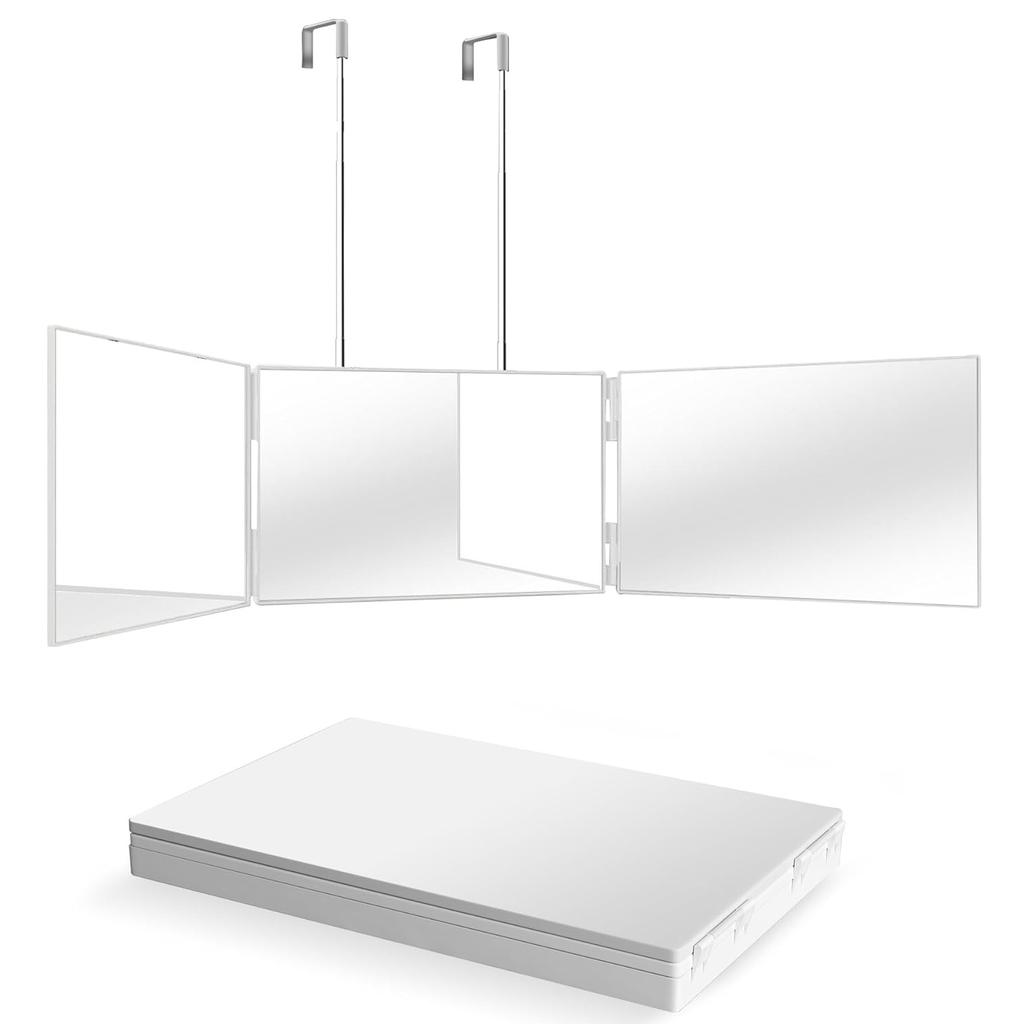 Portable Trifold Vanity Cosmetic Mirror with Height Adjustable Hooks for Self Hair Cutting Makeup Folding for Bath and Travel