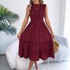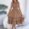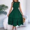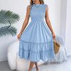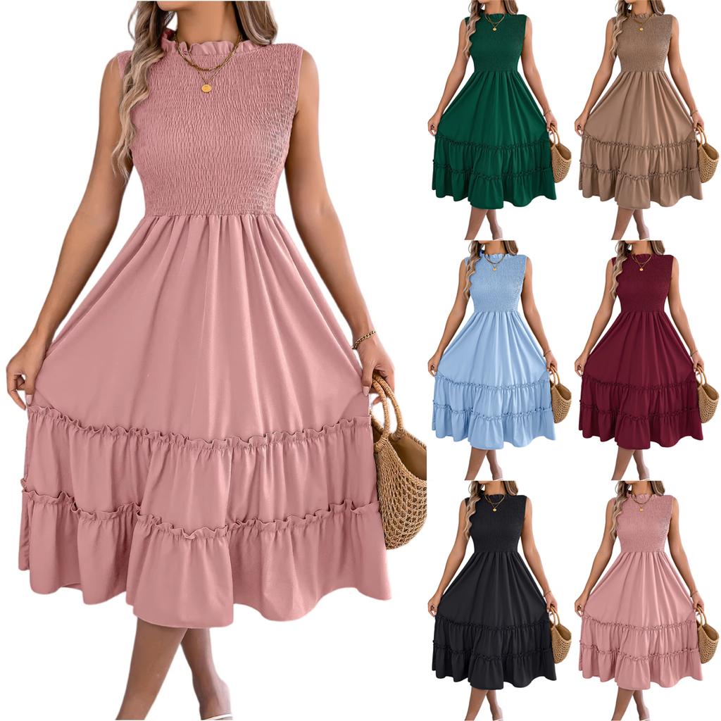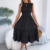 Women's Fashionable Color Round Neck Casual Sleeveless Dress With A Gathered Waist And Black Fungus Edge