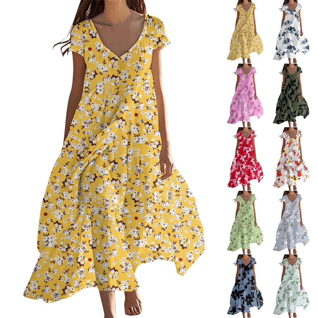 Women's Summer Fashion V-Neck Beach Long Short Sleeve Floral Printed Dresses