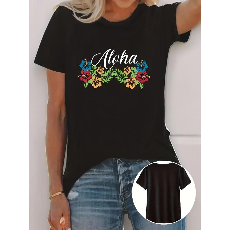Women's Hawaiian Hibiscus Flower Print Tee Crew Neck Short Sleeve Summer Casual Top