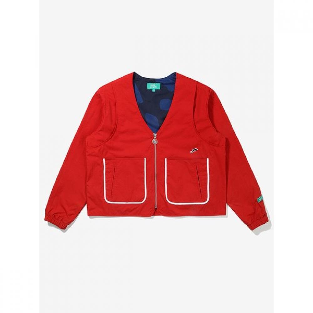 The Women's No-Collar Jacket (BE31JA46W_560) is a lightweight Y-neck style jacket featuring an art wall pattern lining and embroidery points of endangered species. It is made from nylon material that provides a comfortable wear with natural creases.